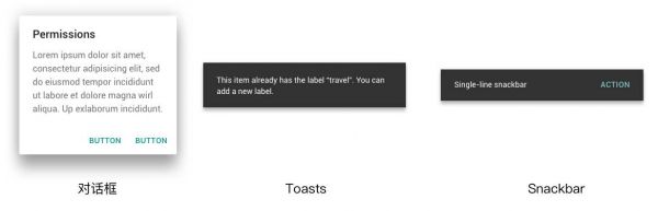 这里要阐述一下Toast,在规范里是规定只有文字,是不能配图标的,所以配图的就不应该叫Toast了,这种样式可以直接理解为一种浮层。同时,Toast也是不能带操作的,如果配操作的,在Material Design里被称为Snackbar,这是Android 5.0新出的控件。Snackbar 是一种针对操作的轻量级反馈机制,常以一个小的弹出框的形式,出现在手机屏幕下方或者桌面左下方。它们出现在屏幕所有层的最上方,包括浮动操作按钮,它同Toast一样3秒后消失。三种样式比较:
