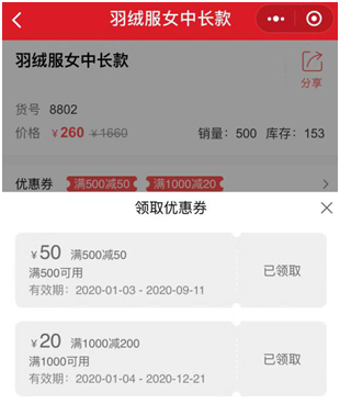 去库存卖货少不了营销活动,活动推广就需要预热,让用户提前知道。我们可通过把商品或小程序店铺海报分享到社群、微信朋友圈、群发好友等通知用户,用户点击即可进入小程序商城店铺购买促销热卖商品领取优惠券。